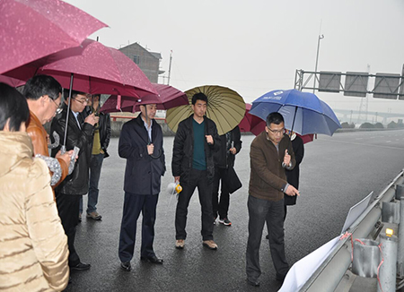 1月4日,市人大副主任沈利農(nóng)帶隊,嘉興市藉省十二屆人大代表冒雨前往杭州灣大橋北接線二期工程開展現(xiàn)場調(diào)研,集團公司總經(jīng)理李云鴻及嘉蕭公司相關(guān)人員陪同。圖為李云鴻總經(jīng)理現(xiàn)場為代表們介紹工程建設(shè)進展情況。