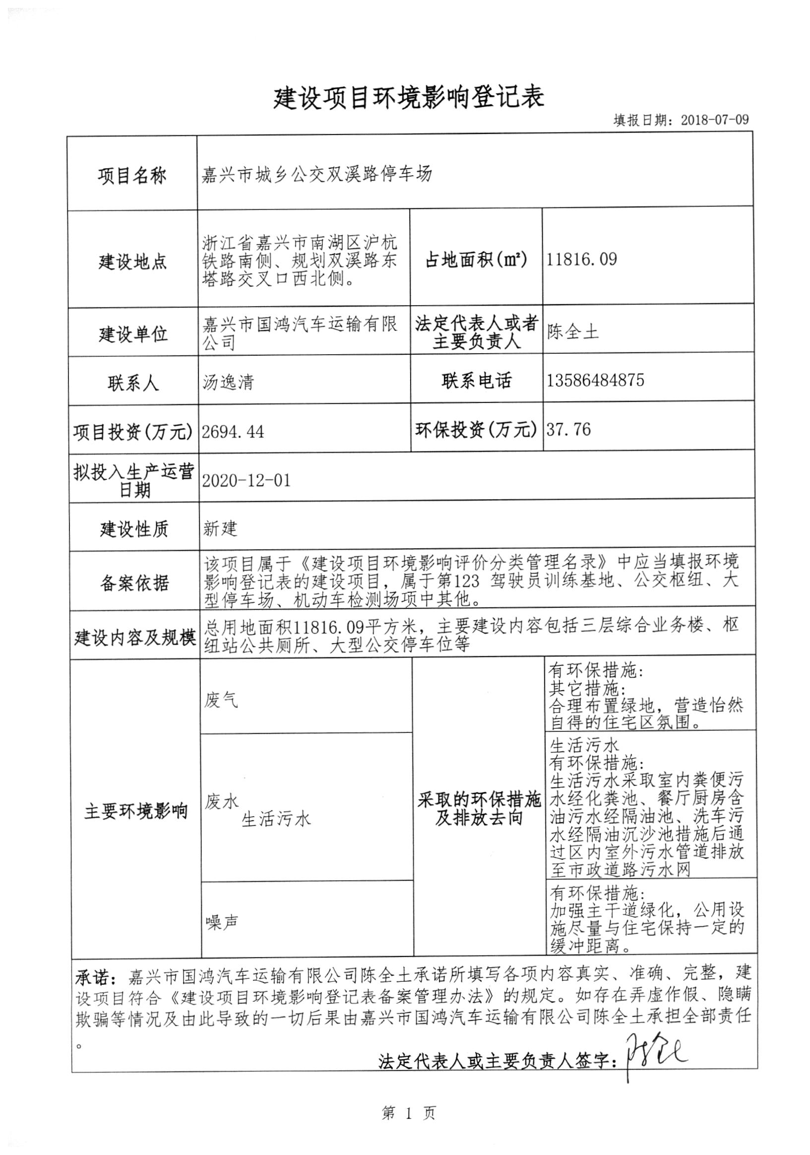 嘉興市城鄉(xiāng)公交雙溪路停車場(chǎng)建設(shè)項(xiàng)目環(huán)境影響登記表