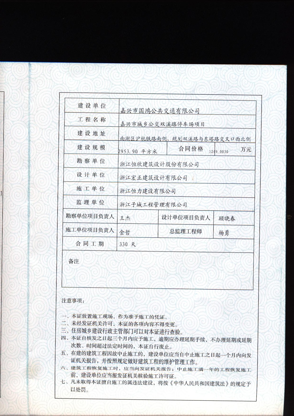 嘉興市城鄉(xiāng)公交雙溪路停車場項目建筑工程施工許可證